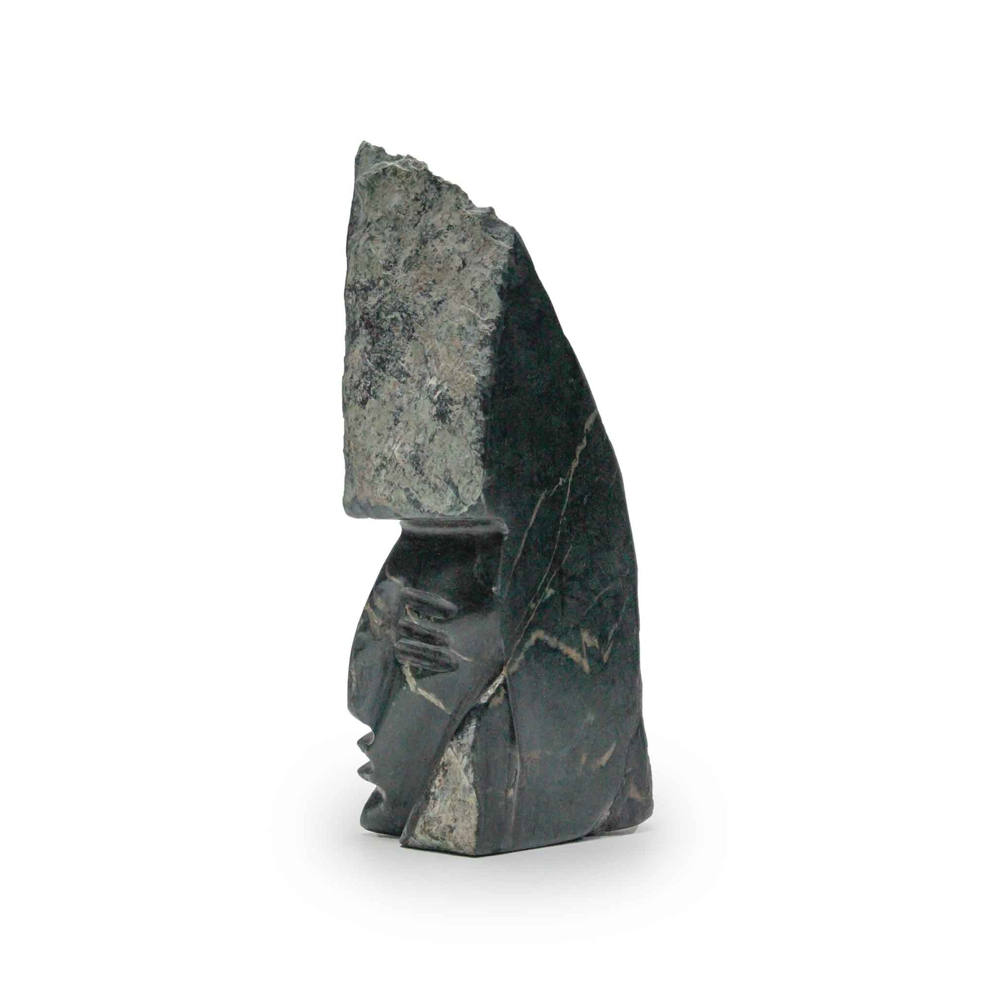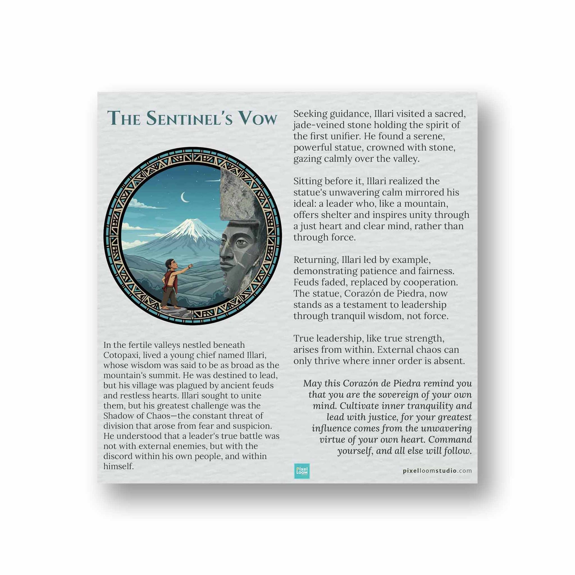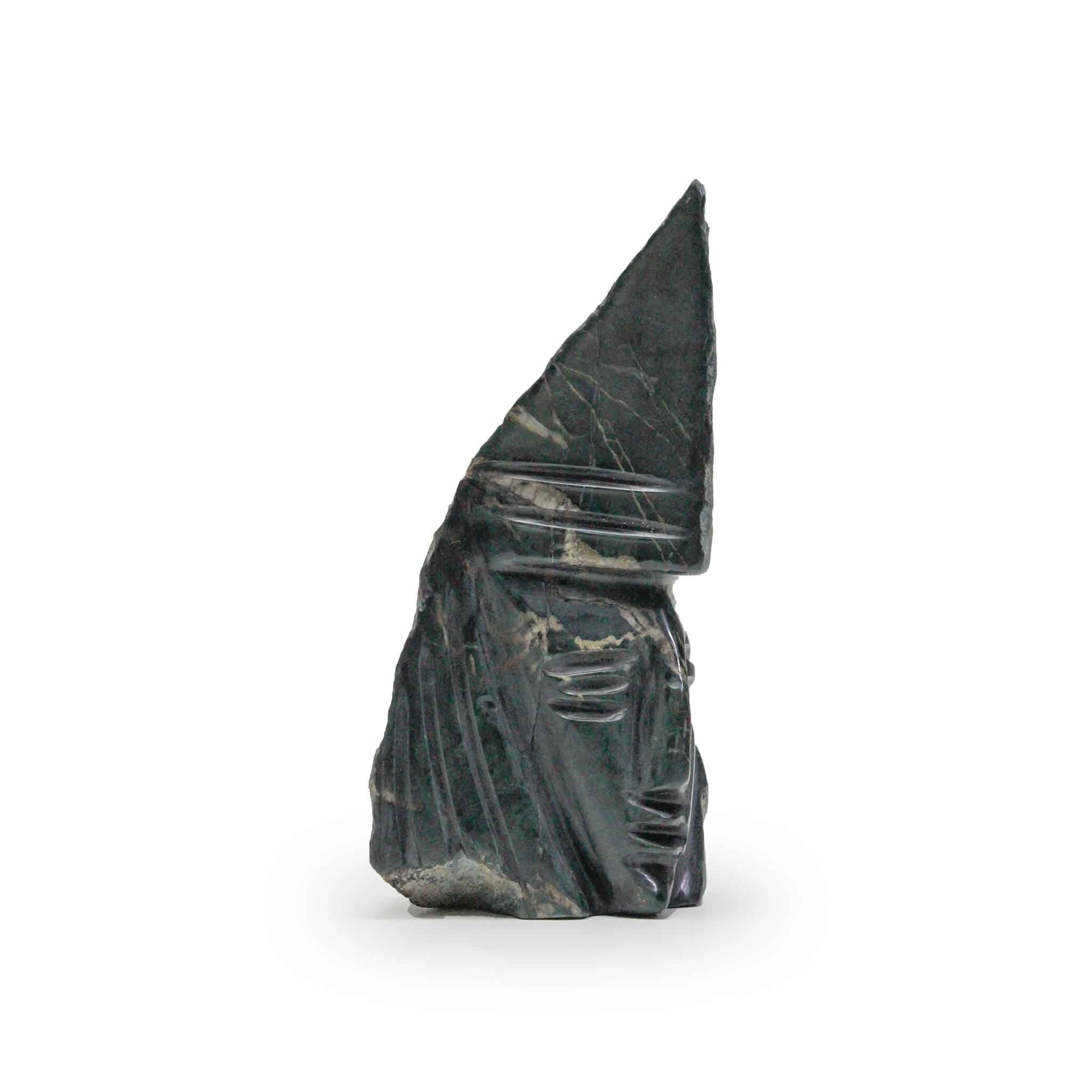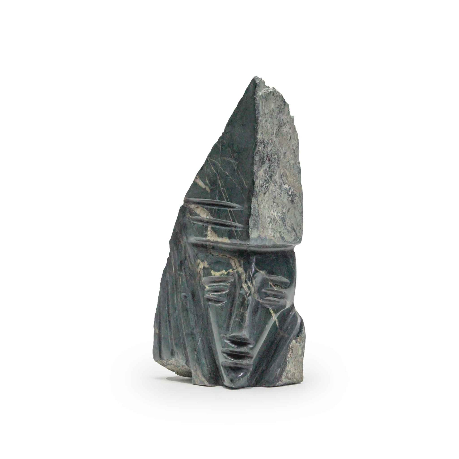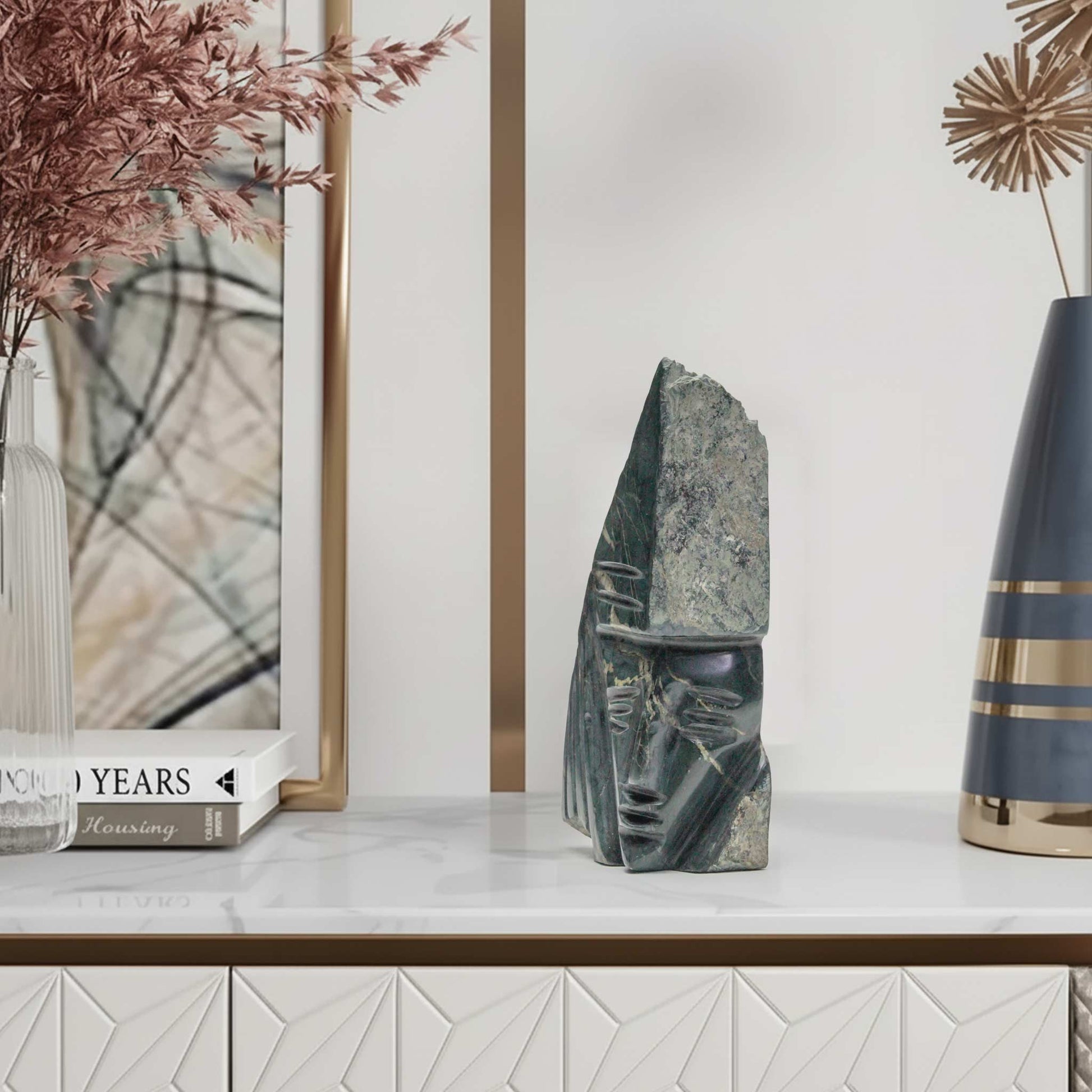From the Corazón de Piedra Collection, this striking sculpture conveys a sense of serene command. Its unique, broad top resembles an ancient headdress, framing a face carved from polished, dark green-black jade. The expression is one of calm resolve, gazing outward with an air of harmonious leadership. Hand-carved by a local artisan in Ecuador, this piece embodies the quiet power that unites and guides. A meaningful and elegant addition to any space, reflecting the tranquil strength of the Andes.