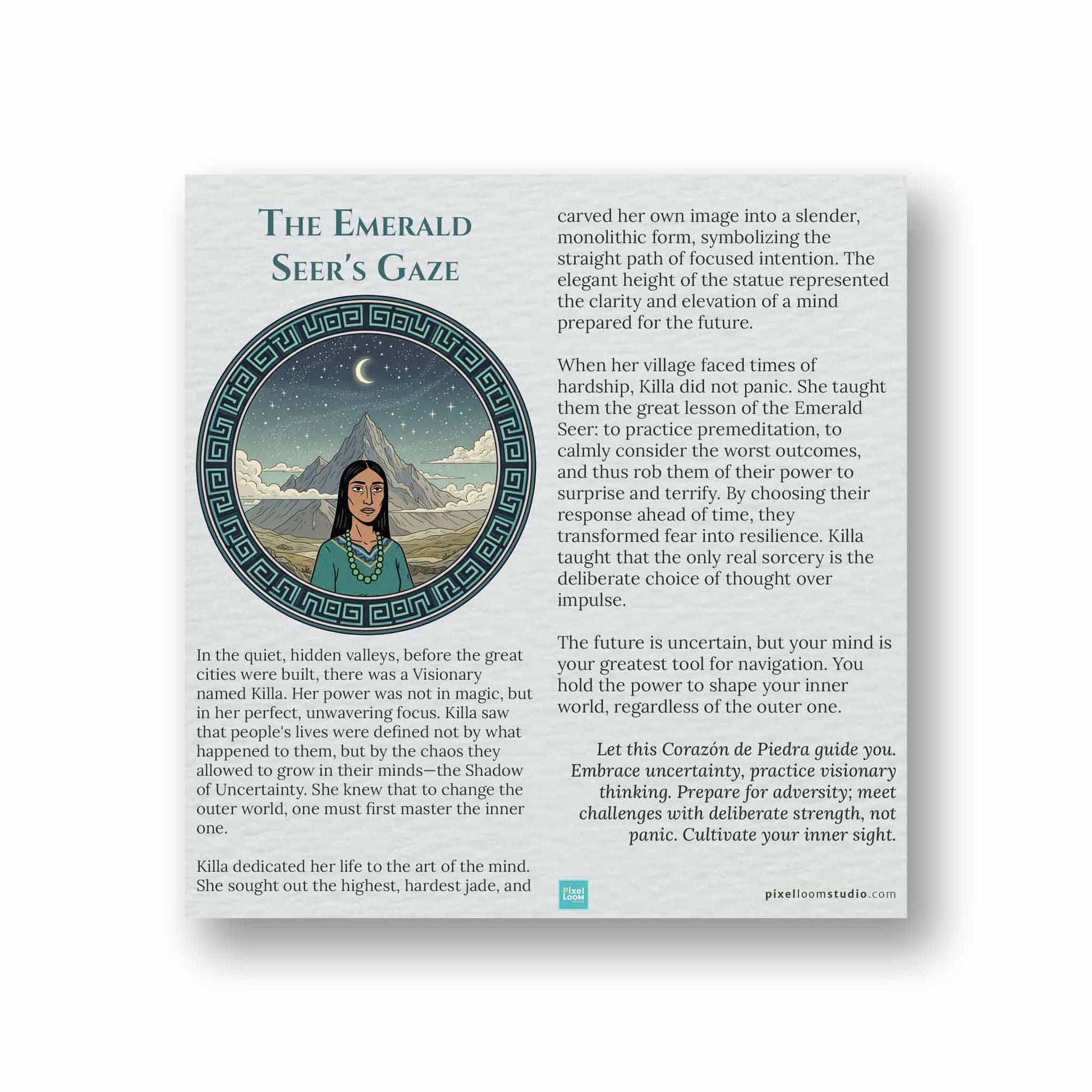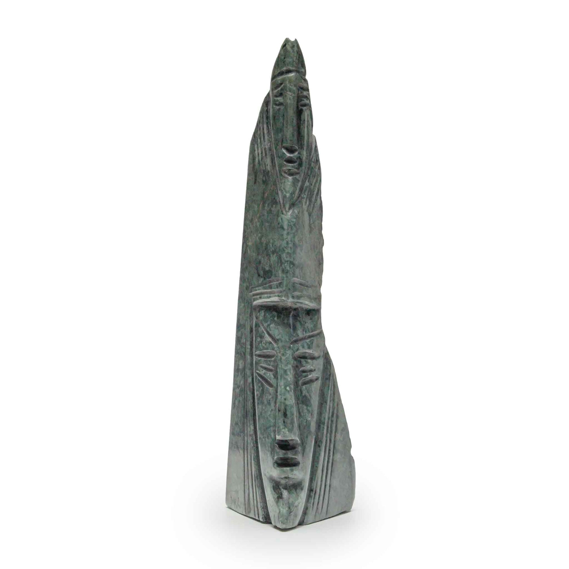 This elegant, monolithic sculpture from the Corazón de Piedra Collection embodies the power of foresight and transformation. Carved entirely from a single block of rich, dark Ecuadorian jade, its striking verticality and stylized features suggest a figure of great lineage and inner sight. The face gazes forward, representing the Magician archetype—the power to transform reality through intention and vision. A sophisticated and visually commanding memento of the enduring magic of the Andes.